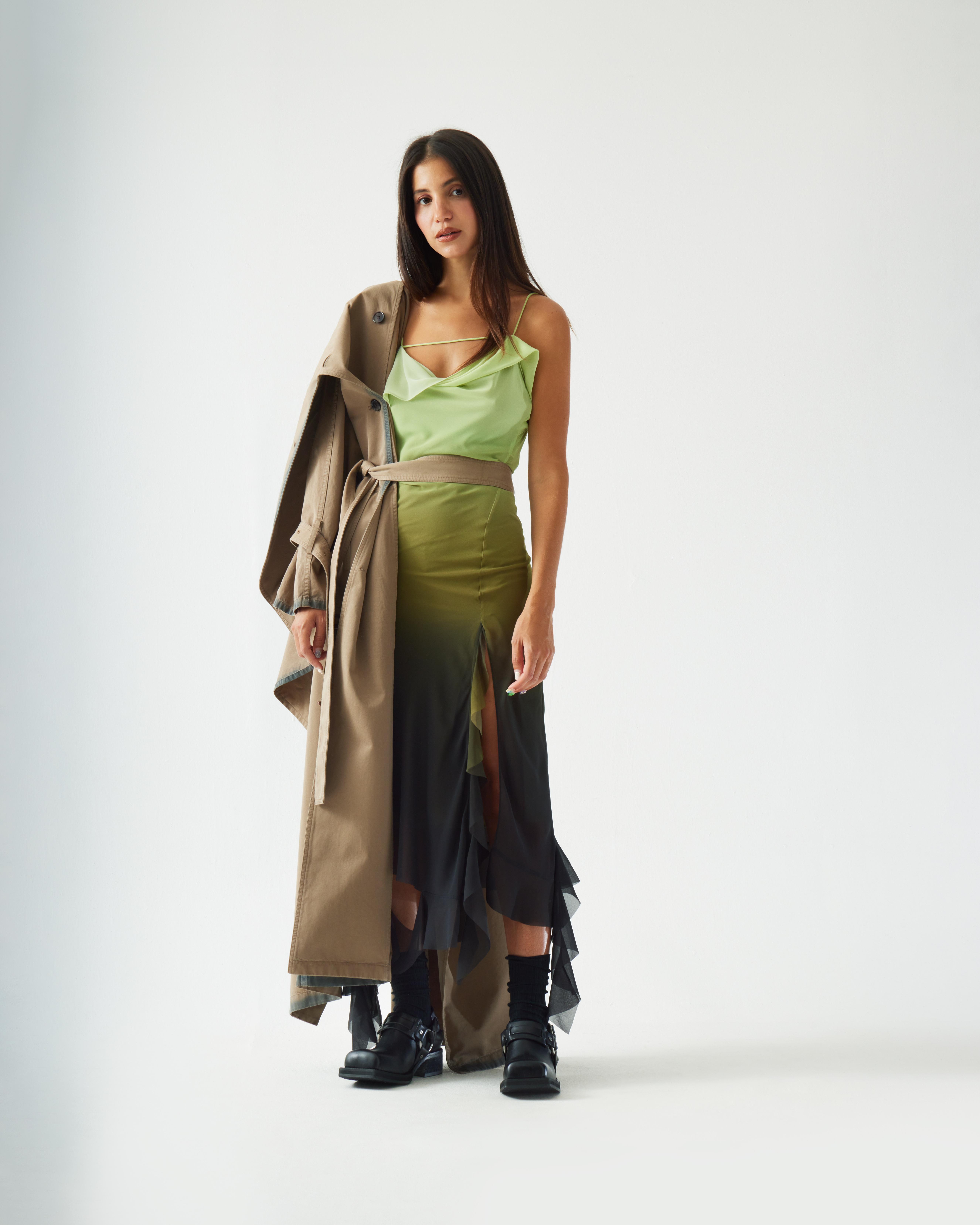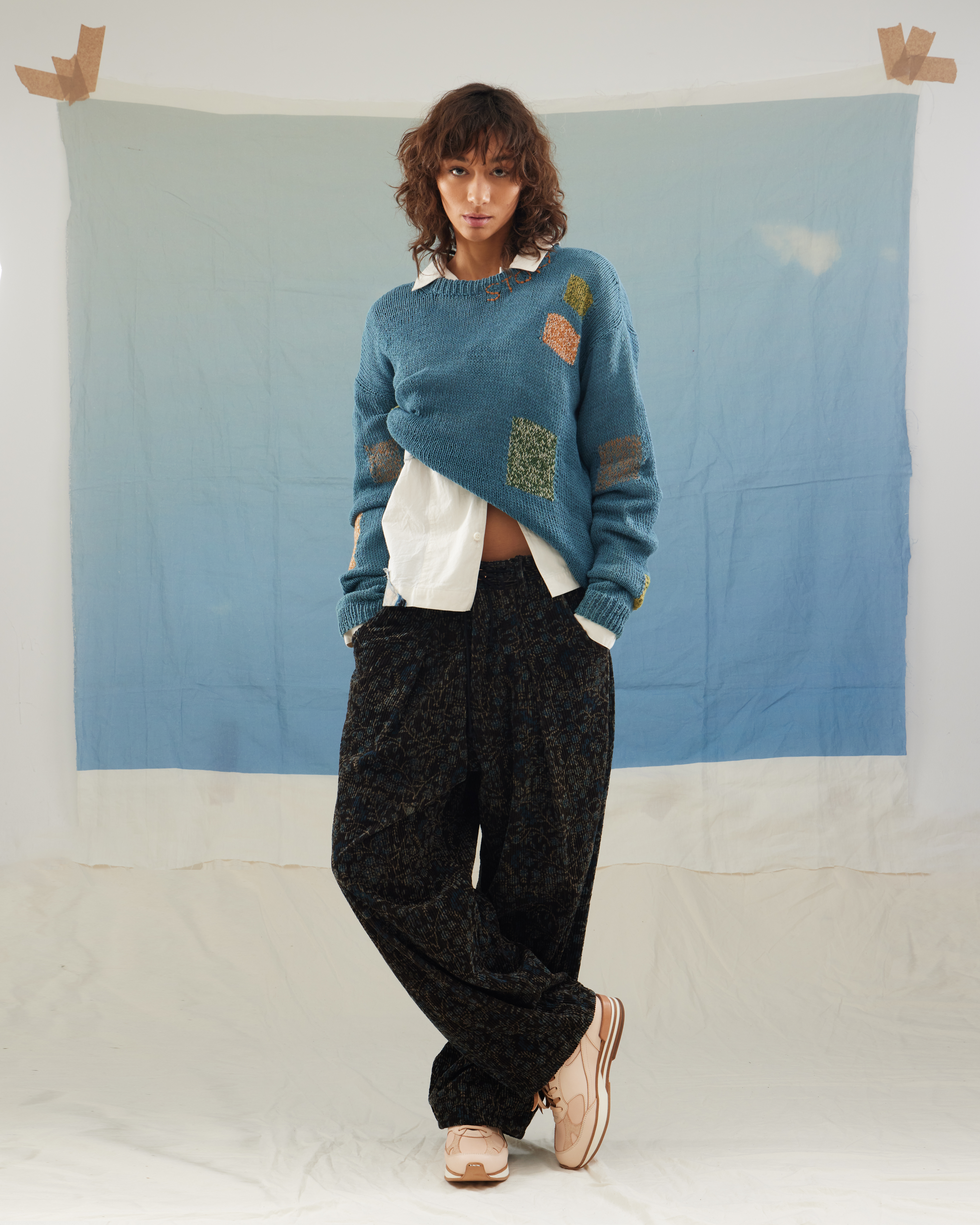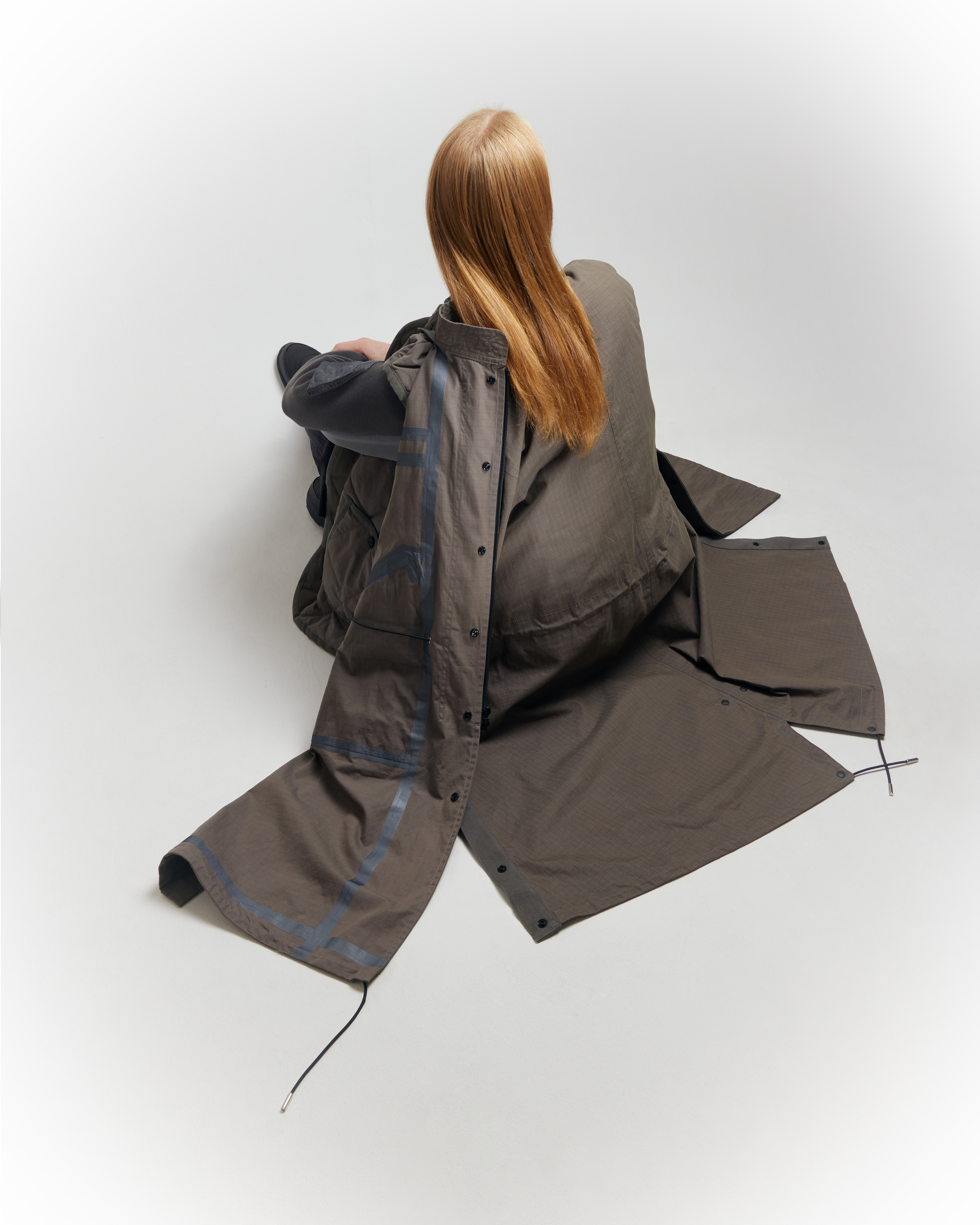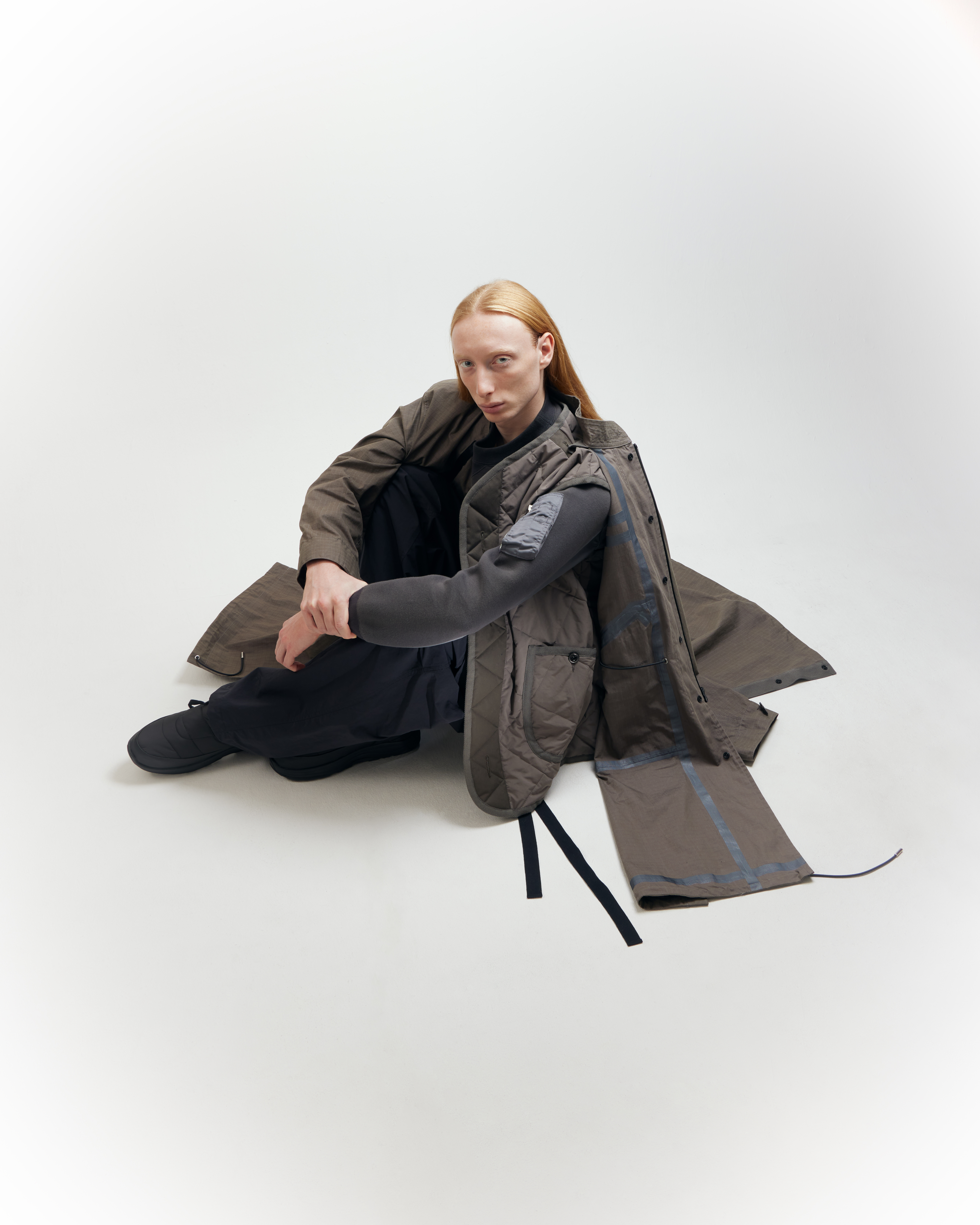 Le stylisme assemble des archives japonaises par Gaijin (Issey Miyake, Yohji Yamamoto, Comme des Garçons) avec des pièces contemporaines (Lemaire, Paloma Wool, Stone Island). Les looks sont pensés comme des compositions sculpturales : le corps tend, plie, contraint ou relâche la matière, révélant des relations inattendues entre fibres, densités et lignes.